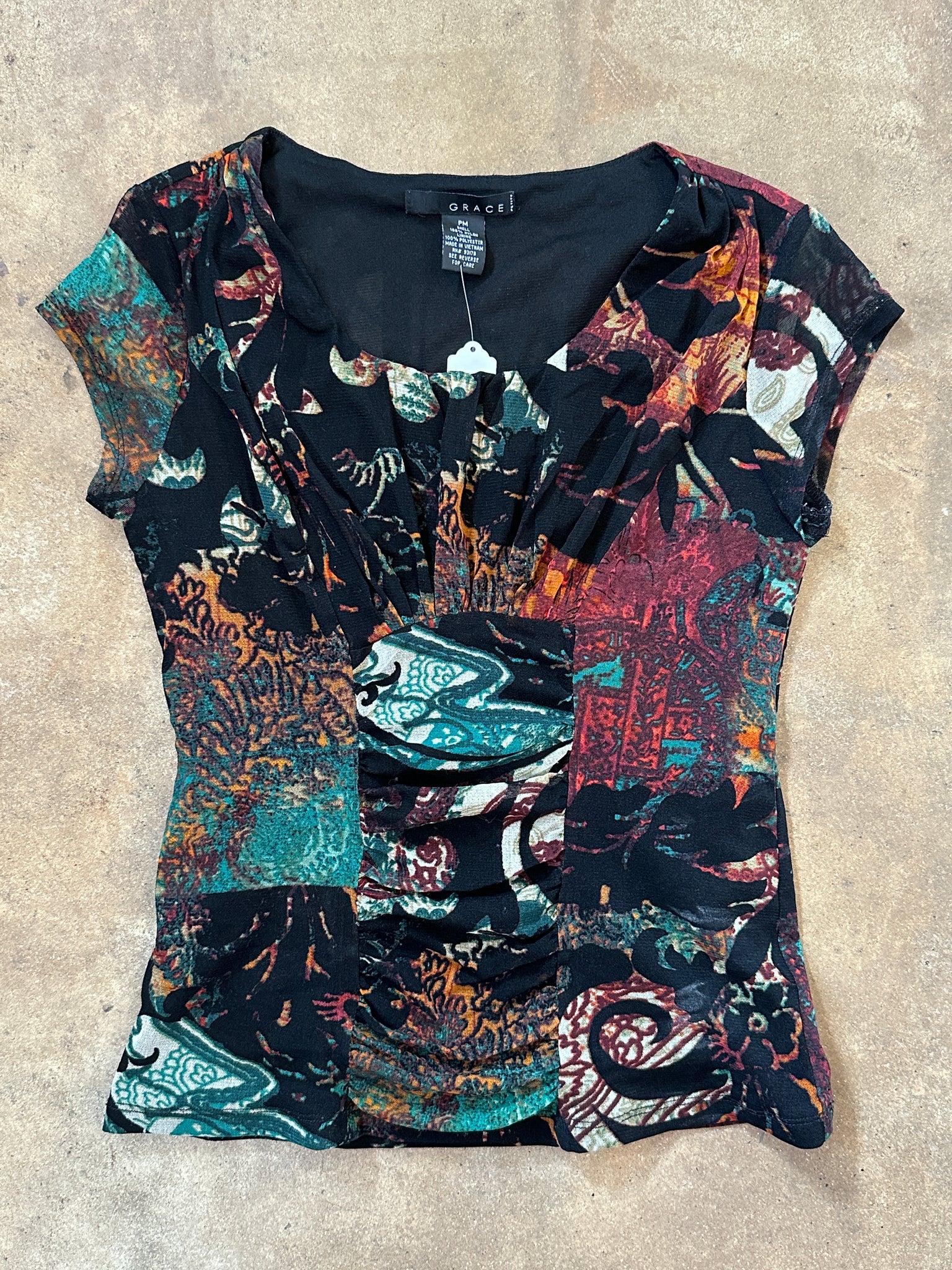 2000’s mesh top. Abstract paisley and floral patchwork print on a black base. The design includes ruching down the center front and slightly gathered cap sleeves.
